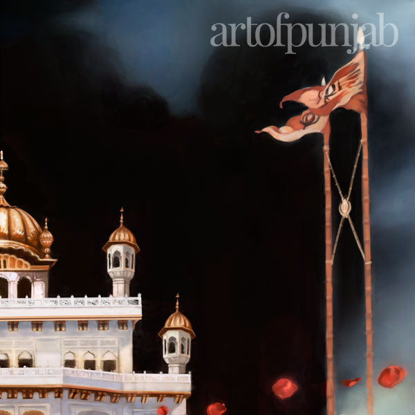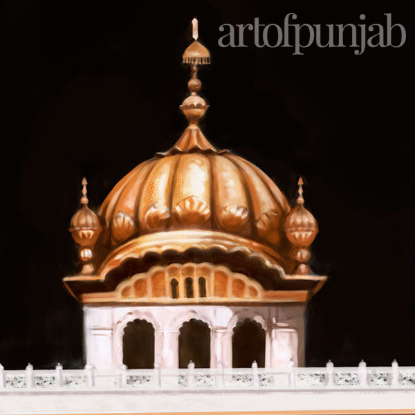 This painting illustrates what Sri Akal Takhat sahib, the central legacy of Guru Hargobind sahib our sixth Guru, means to the Sikh quam. The artwork weaves the stories and imagery we relate to Guru Hargobind sahib, such as Bandhi Chhor and Miri Piri to capture the essential nature of our eternal bond to the Akal Takhat as central institution of Sikhism.