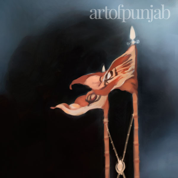 In this painting, the visualization of blood transforming into flower petals is a reminder that liberation can be found through sacrifice, when the cause is just. Countless shaheeds throughout our history teach us, that with the grace of the Guru and the willingness to bow ones heads in sacrifice, a transformation in the very depths of our being can be experienced. This perfect union of Miri Piri, the inseparable connection between Sri Harimandir Sahib and Sri Akal Takhat sahib is shown in the painting as two interwoven energies. Within their merger we see the khanda and the bata which represents the formation of the Khalsa panth and creation of a new type of being, the saint soldier.