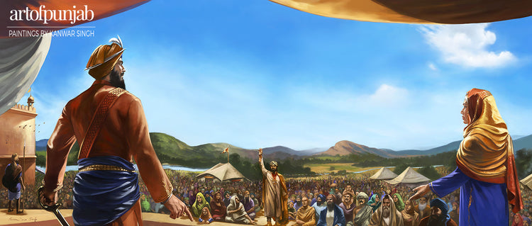 Bhai Daya Ram of Lahore, Punjab, is the first to raise his hand when Guru Gobind Rai asks for a volunteer willing to give his life in service of humanity. Mata Sahib Kaur looks on at the crowd of thousands that has gathered from across the land in response to the Gurus call. Transformed through Amrit into Daya Singh, he became one of the first 5 Khalsa, the Punj Pyaarey (the beloved five). -