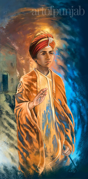 In the prolonged siege of Anandpur in 1705, Sahibzada Ajit Singh displayed his qualities of courage and steadfastness. An unequal but grim battle commenced on 7 December 1704 in the words of Guru Gobind Singh's Zafarnama, a mere forty defying a hundred thousand. The besieged, after they had exhausted the meagre stock of ammunition and arrows, made sallies in batches of five each to engage the encircling host with sword and spear. Sahibzada Ajit Singh led one of the sallies and laid down his life fighting in the thick of the battle. He was 18 years old at the time of his supreme sacrifice for his faith. -
