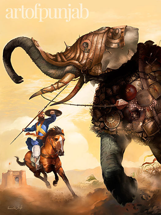 Initiated into the Khalsa on the historic first Vaisakhi Day, Bachittar Singh fought alongside Guru Gobind Singh in a number of battles in defense of Anandpur. This scene shows him in the famous single-handed combat with the enraged elephant charging at the Sikh fort of Lohgarh by the joint enemy forces of the Mughal Emperor Aurangzeb and the Hindu Hill Rajas. -