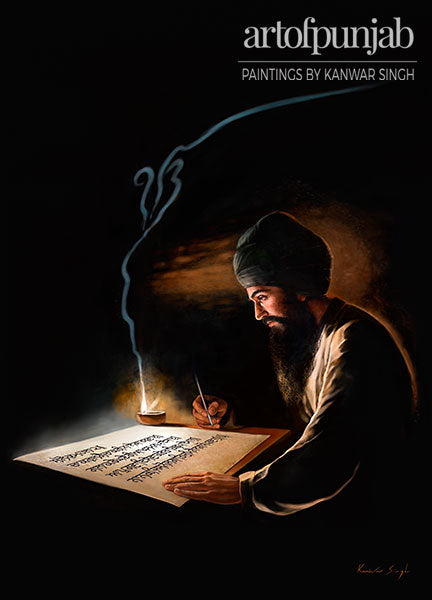 Guru Angad Sahib the second in the line of Guru Nanak, prepares to write the Gurmukhi alphabet.Before he left his body, Guru Nanak Sahib passed on the Guruship of the Sikh Panth to Bhai Lehna. Lehna, through a series of tests, had proven his worth as the successor to Guru Nanak. Guru Nanak gave a new name to Lehna, naming him Guru Angad Sahib. Angad means “of my body”. Guru Nanak Sahib wanted the Sikh Panth to understand that though the Guru has changed his body, the light of the Shabad, the Divine light of the Guru, was the same. Guru Angad Sahib was simply the new Nanak. As the new Nanak, Guru Angad Sahib continued the work of his mentor. Guru Nanak had built a strong foundation, and Guru Angad developed the Sikh Panth from that base. Primarily, Guru Angad is remembered for is his refinement and standardization of the Gurmukhi script. This is the script of the Sikhs and is one of the two standards alphabets used for the Punjabi language today.