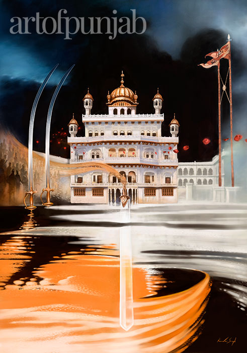 The Harimandir Sahib is the heart of the Sikh Panth. It was conceived by Guru Ram Das ji when he built the sarovar on the site of a holy pool of water in the city of Amritsar, which he also founded. The next master, Guru Arjun completed the Harimandir sahib and installed the Adi Granth, the primal Sikh scriptures, within its walls. Harimandir sahib, in the time of the Gurus was not yet covered in gold but was already revered as the centre of Sikh spiritual life and the seat of the Gurus. Guru Hargobind would have looked across at its’ wondrous forms as he built the Akal Takhat to give Sikhs a place to settle all political and temporal affairs. Later Guru Teg Bahadur ji would sit upon the opposite edge of the sarovar and looked upon its’ four entrances with a pilgrim‘s longing when he was denied entry by the disloyal mahants. Nonetheless, the Sikh sangat of Amritsar still embraced their Guru within its’ view and today a small shrine marks that place on the sarovar in remembrance of their faith. Harimandir sahib has and will forever remain a vision of sanctity and peace within the hearts of every Sikh who lays eyes upon it. -