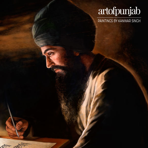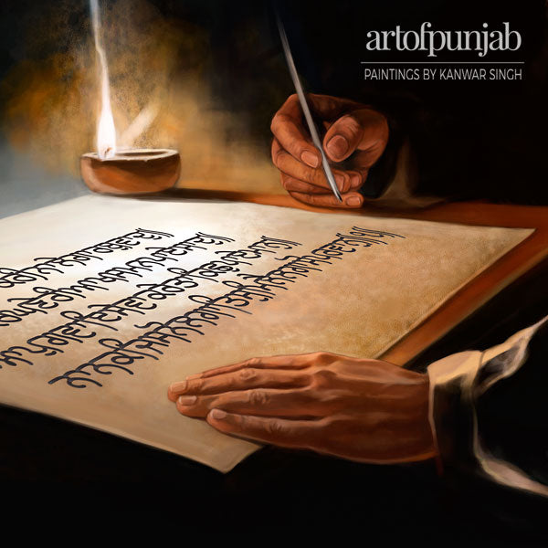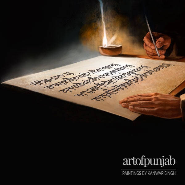Guru Angad Sahib prepares to write the Gurmukhi alphabet.